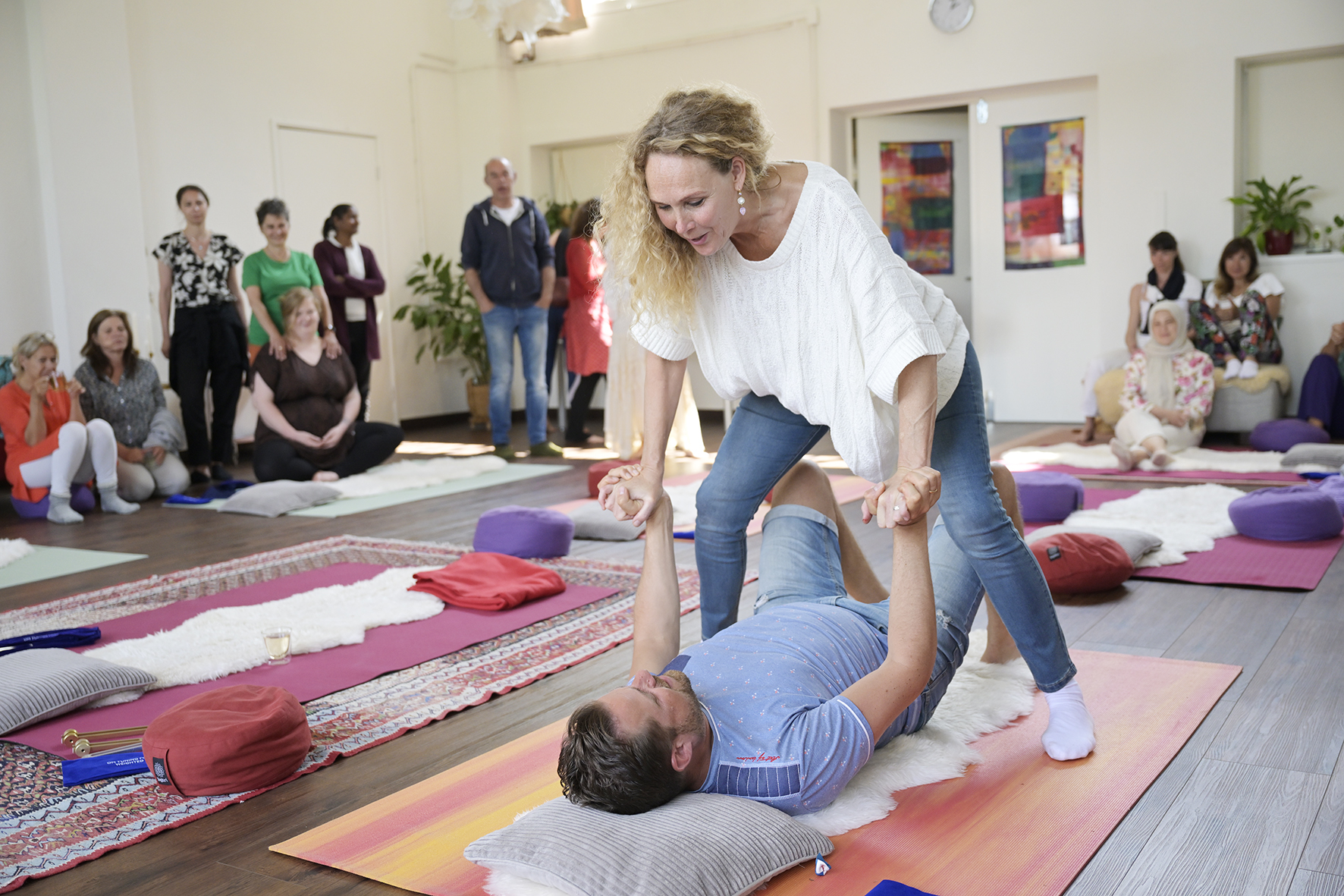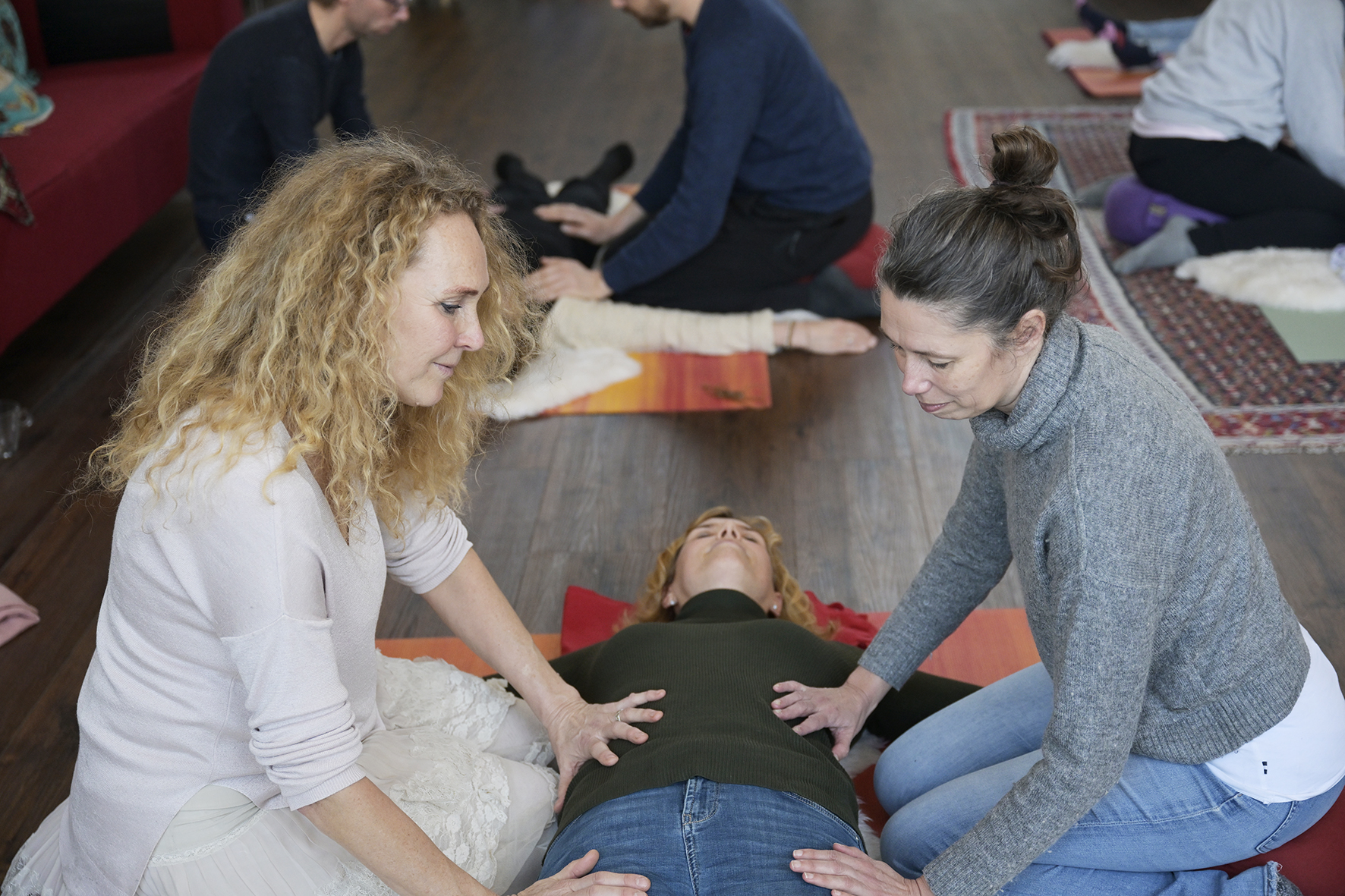 De groep bestaat doorgaans uit 8 tot 10 personen. In de ruimte liggen matjes, schapenvachten en dekentjes klaar, zodat je comfortabel ligt tijdens de ademreis. Het is uiteraard prima om je eigen matje of dekentje mee te nemen. Wanneer iedereen een fijn plekje heeft, beginnen we met een uitleg over de verbonden ademhaling.