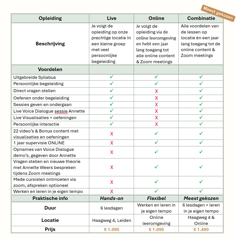 Inschrijven voor de Voice Dialogue LIVE en COMBINATIE training? Klik hieronder op "naar bestellen" bij de opleidingsdata van jouw voorkeur. Kies daarna een van deze opties.